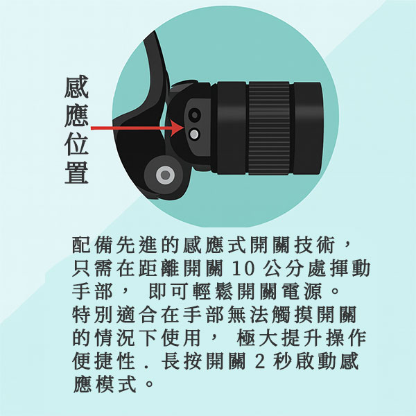 開關: 輕按:強、中、弱、閃;長按:SOS;長按啟動感應模式